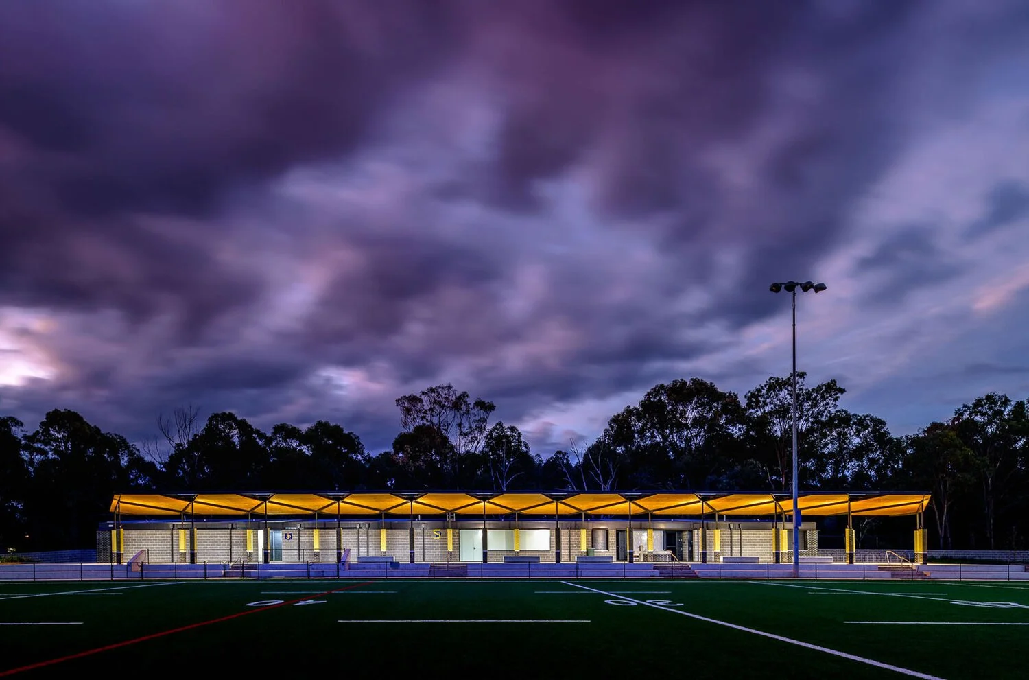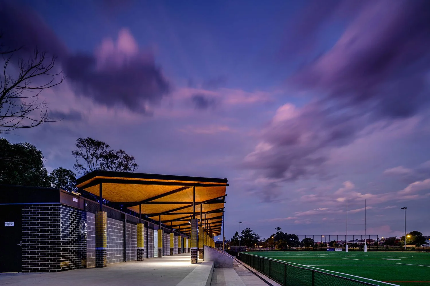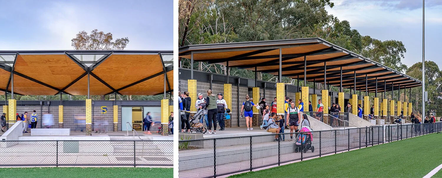 The tectonic expression of the colonnade structure is playful, drawing on some imagery associated with the NRL. The columns have a tiled finish each with bands of colour reminiscent of the different coloured player’s socks. The roof incorporates a laced underside of the structure which references players football boots. This design approach assists in activating the length of the building both from a distance across the field and when walking along its length.
