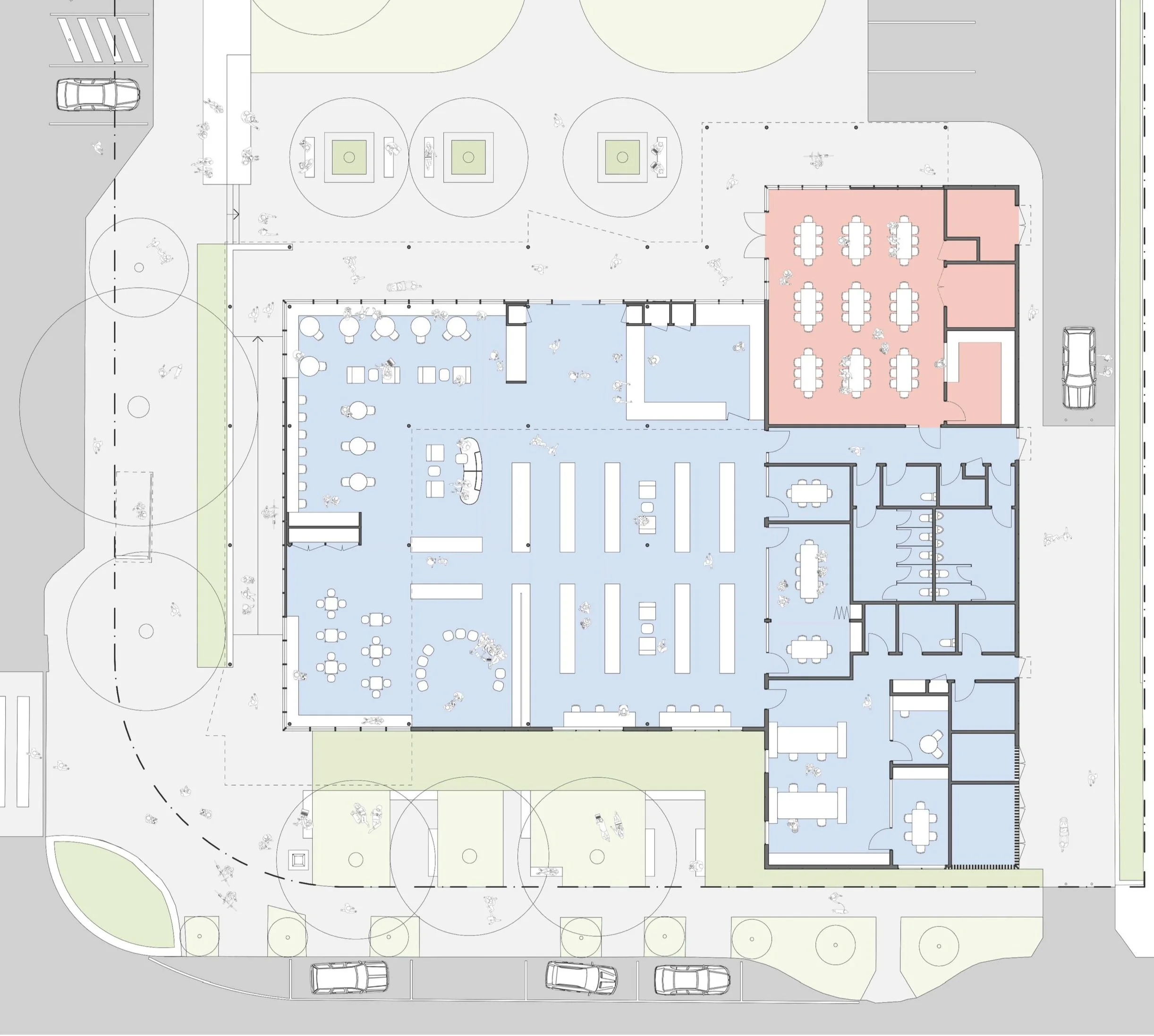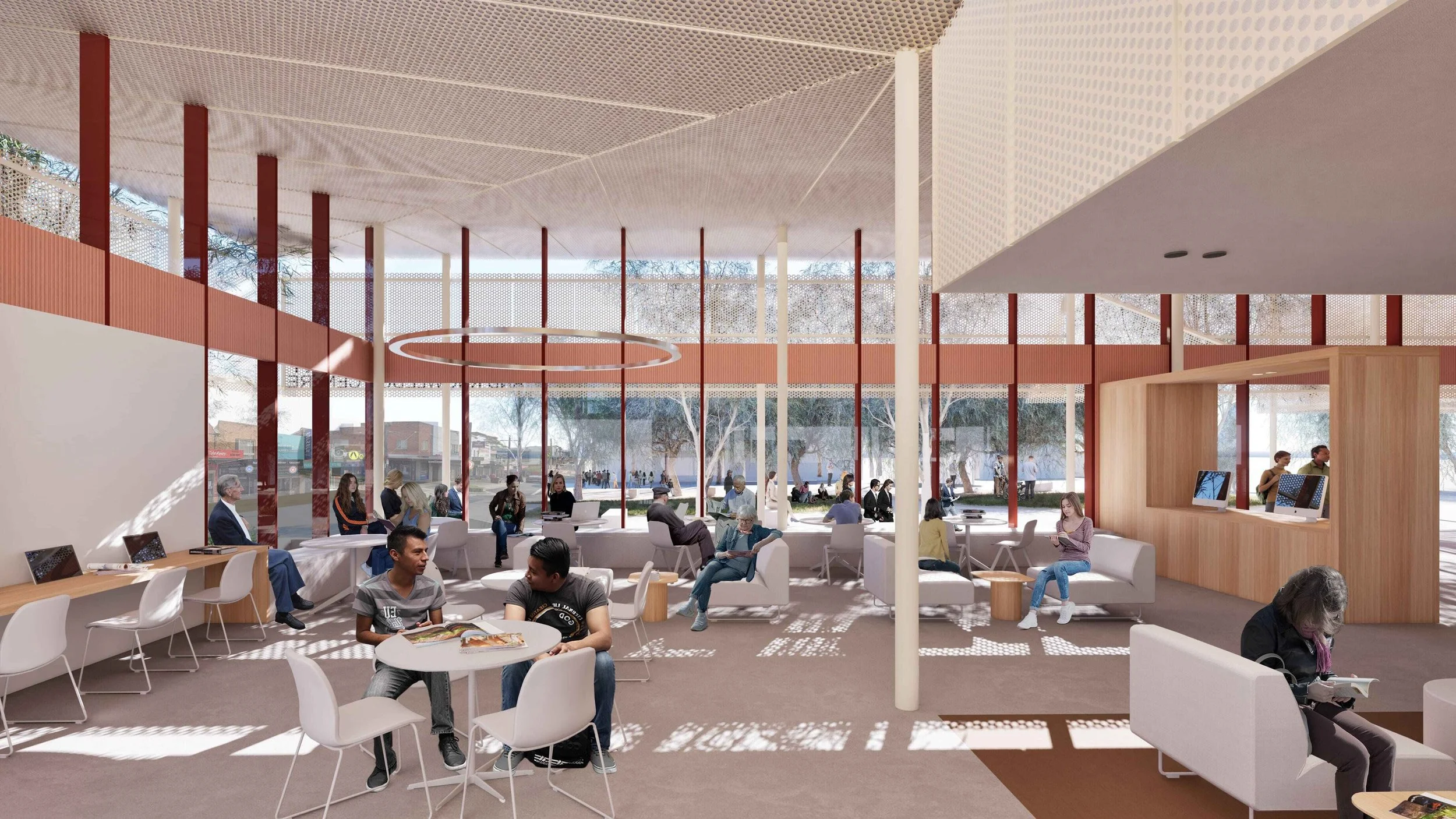 Active, primary spaces of the building address the street frontages and park, creating a ‘ribbon of activity’ within the village centre. Expressed as a taller, more civic-scale volume, internally the ribbon wraps to form a west- and north-facing ‘public room’, with views to the activity of the town centre and park. This civic volume then extends externally to form a generous, shaded external covered way, which connects the building to the primary street addresses and the north-facing public plaza and park. The new park and plaza include open lawn areas, seating, and provision for community activities such as markets, while protecting existing significant trees.
